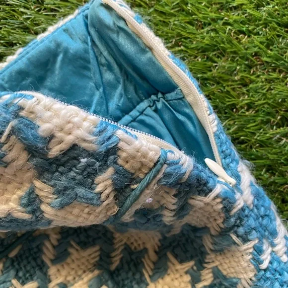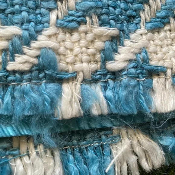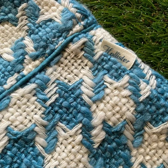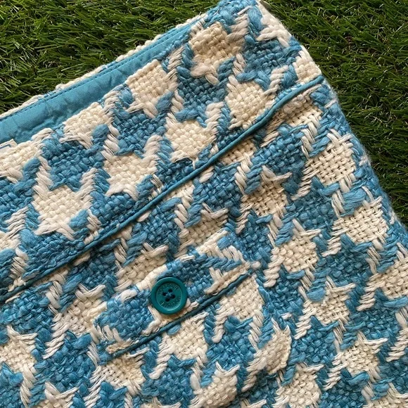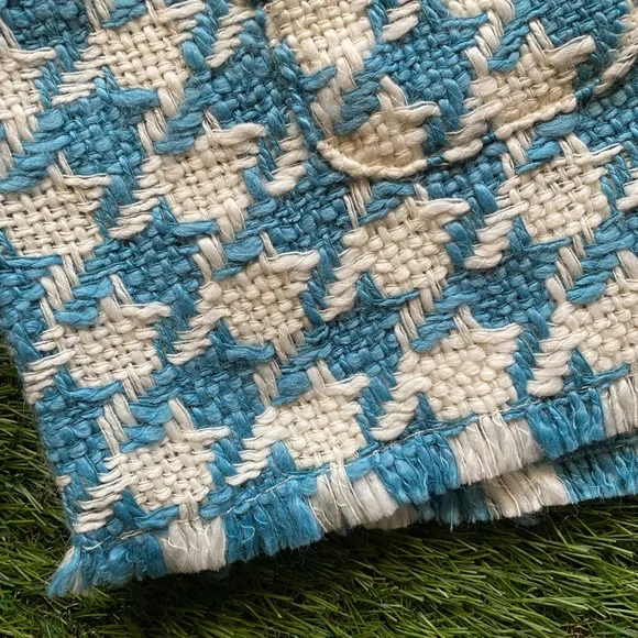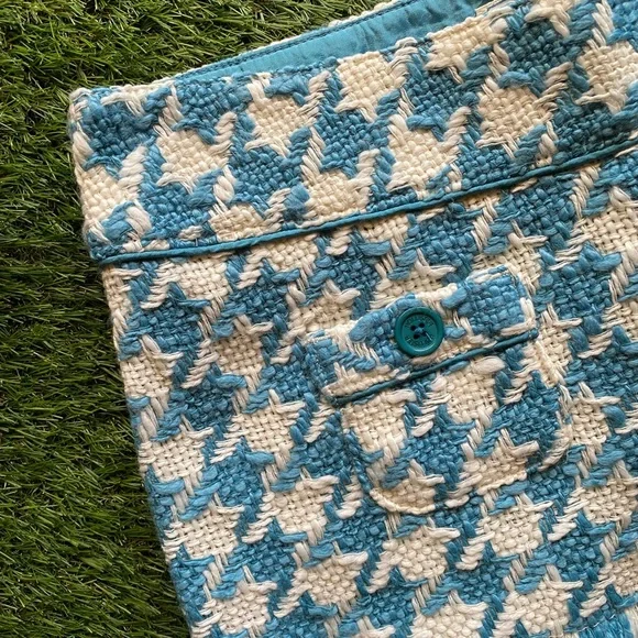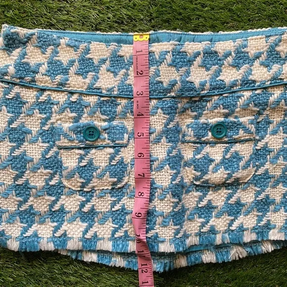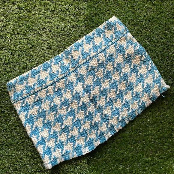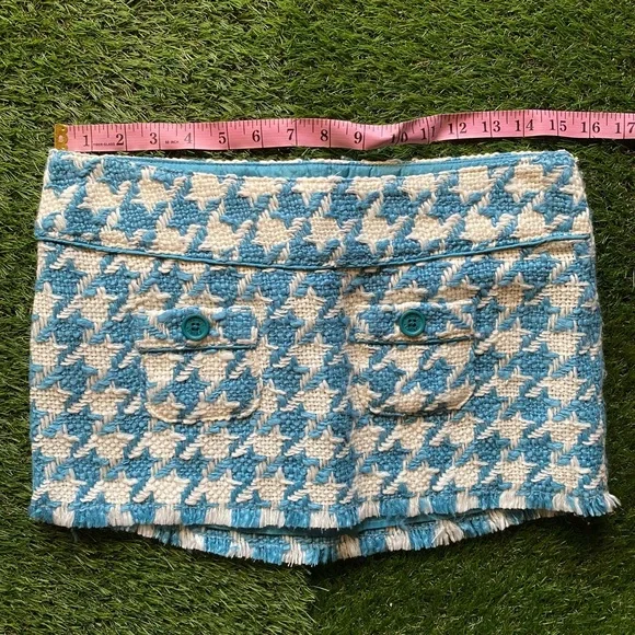 Vintage Hollister Co. skirtWhite and blue (aqua/turquoise) houndstooth designWool blendDry clean onlyNew with tags (extra button attached)Two front pockets with button detailsSide zipper enclosureSkirt is linedLow rise waist lineFringed hem lineVintage . Y2K . Micro Mini . Low rise . Paris Hilton . Retro . Spring . 2000s . 00s . Bratz . Mean Girls . Trendy
