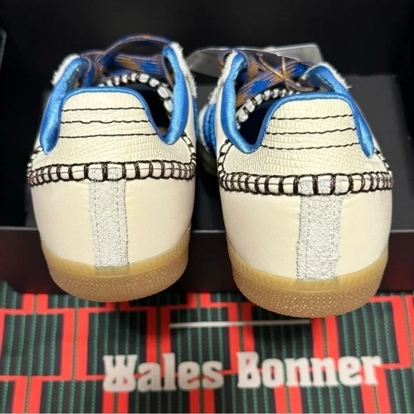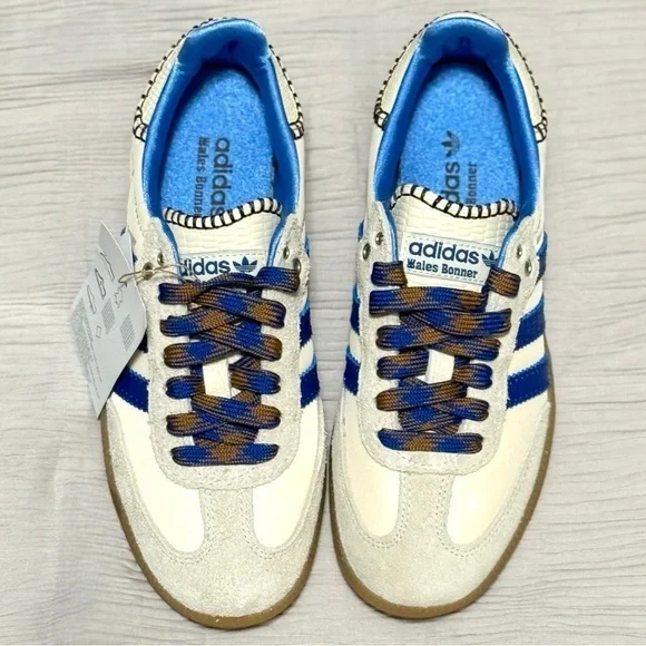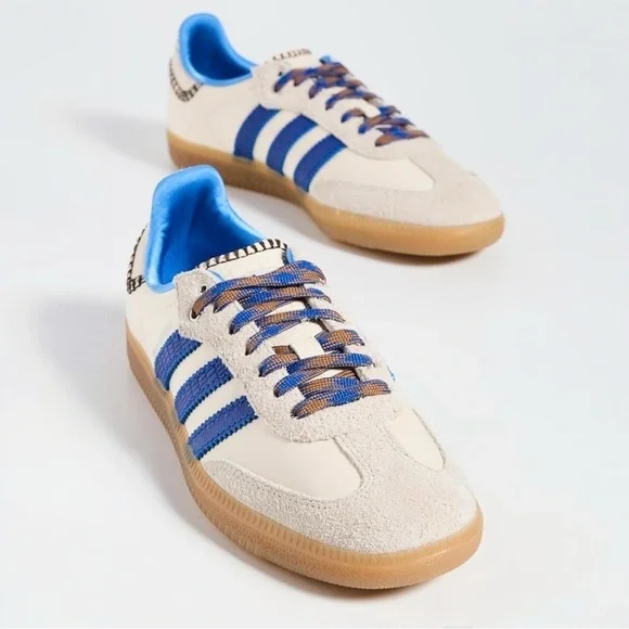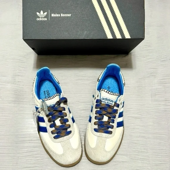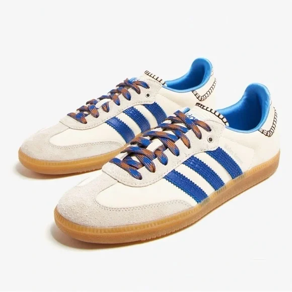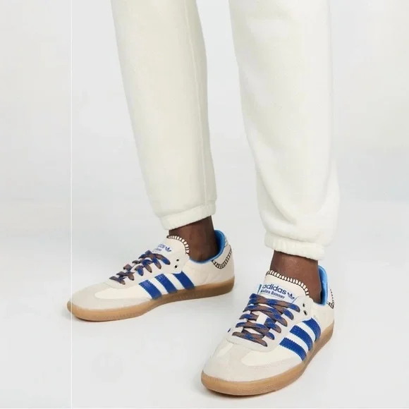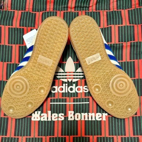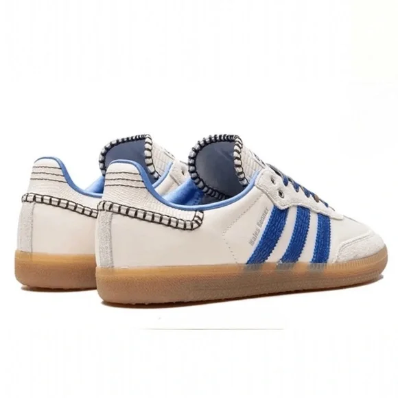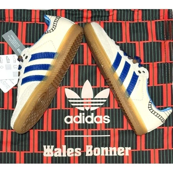 Adidas × Wales Bonner Samba "Wonder Clay Royal Blue" Women’s sneakers Size 4.5 NEWCollectors Addition Rare size. Part of the Wales Bonner x adidas Originals collaboration. Supplier color:Wonder clay/Royal blue/Wonder white.Brand Style ID:1H7756THE DETAILS• white/royal blue• leather• suede panelling• contrast stitching• logo stamp at side• signature 3-Stripes logo• round toe• front lace-up fastening• logo patch at the tongue• branded insole.• gum-rubber sole.Low-top nylon twill and suede sneakers in off-white.. • Lace-up closure • Logo patch at tongue• Blanket stitching at tongue and heel tab • Padded collar.• Logo stamp at outer side • Serrated stripes at sides.• Snake-embossed leather heel tab .Satin lining • Treaded crepe rubber soleCompositionRubber, Fabric, Leather brand, new, and original box included theWales Bonner x adidas Originals collaboration duster shoe bag Wonder clay/Royal blue/Wonder white.Brand Style ID:1H775Brand new OG original adidas comes with Duster bag and original shoe box